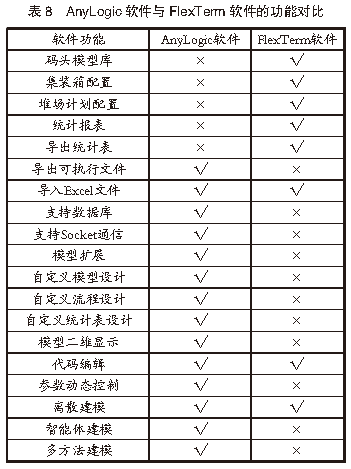 通過仿真分析結果與實際作業(yè)數(shù)據(jù)的對比發(fā)現(xiàn),仿真分析結果與港口實際運行數(shù)據(jù)差距較小,表明AnyLogic仿真模型和FlexTerm仿真模型都能準確可靠地模擬港口實際堆場作業(yè)情況,能夠滿足港口堆場仿真需求,并有助于提高港口堆場仿真的準確度和可信度。此外,通過分析堆場仿真作業(yè)流程還發(fā)現(xiàn),通過調整堆場仿真系統(tǒng)的輸入條件能提升AnyLogic仿真模型和FlexTerm仿真模型的仿真效果,其中:通過調整輸入條件對應的關鍵參數(shù)來提升AnyLogic仿真模型的仿真效果;通過修改輸入條件中作業(yè)計劃模塊的船期、堆場計劃等相關配置來提升FlexTerm仿真模型的仿真效果。4.3 軟件功能對比回顧整個堆場仿真作業(yè)流程發(fā)現(xiàn),2款軟件在功能應用方面存在一定差異。根據(jù)仿真作業(yè)流程和仿真分析結果,對2款軟件的功能進行對比分析,AnyLogic軟件與FlexTerm軟件的功能對比見表8。
