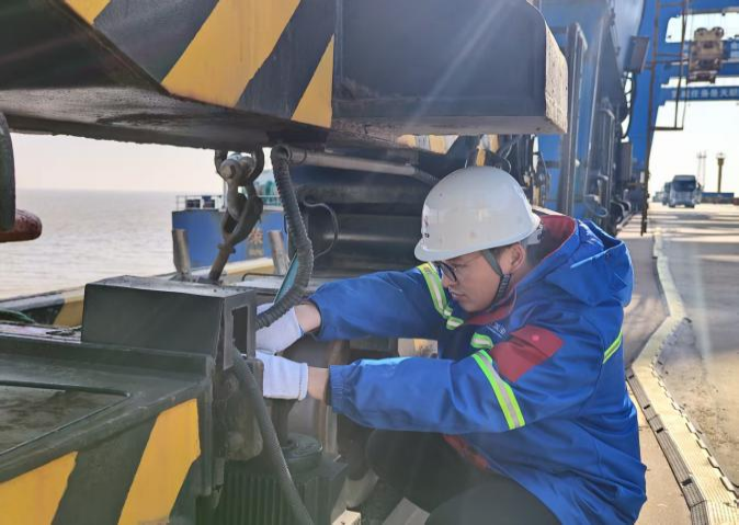寒冬的晨霧還未散盡,陳濤正俯身蜷縮在狹小空間里,滿手油污的指尖精準對接著老化油管,他的額角滲著細汗,眼神卻專注如尺,每一次扳手轉動都力道均勻,仿佛在完成一場精密的外科手術。“這臺設備承擔著糧食轉運的關鍵任務,油管老化漏一滴油,都可能耽誤整船貨的周轉。”他頭也不抬地說著,手邊的工具包敞開著,扳手、螺絲刀的金屬表面泛著溫潤光澤,那是十年如一日的打磨,刻下的不僅是使用痕跡,更是與鋼鐵的默契。在碼頭上,陳濤是公認的設備醫生,大到正面吊機的液壓系統,小到輸送設備的一顆螺帽,他都了如指掌。今年汛期,一臺門機突然卡殼,若不及時修復,整船糧食可能受潮變質。陳濤帶著班組連續奮戰3小時,跪在泥濘里排查線路、更換零件,直到設備重新運轉。
